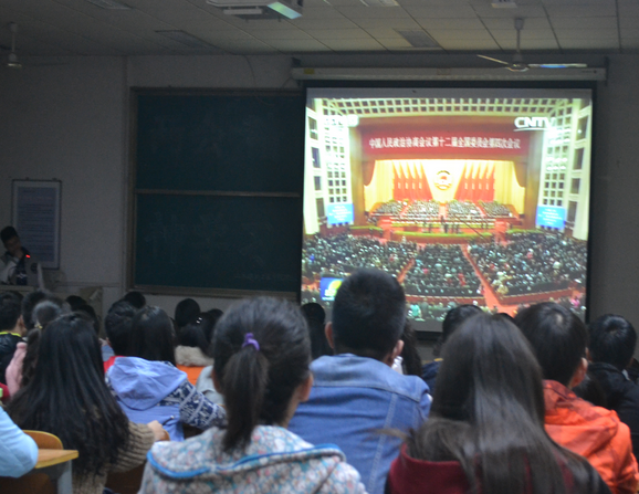 首先,全体团学骨干一起观看了“两会”的相关视频,接着还进行了“两会”精神的讨论。今年的两会,是审议和批准“十三五”规划纲要,动员和团结亿万中华儿女以新的理念贯彻落实《纲要》的盛会。全国人民热切期望两会以党的十八届五中全会精神为指导,集中全体代表、委员的智慧,建嘉言、献良策,切实把规划纲要制定好,共同绘就时代宏图。同学们在讨论中围绕着“反腐倡廉”、“重拳治污”、“供给侧改革”、“新常态”等关键词展开了热烈发言。