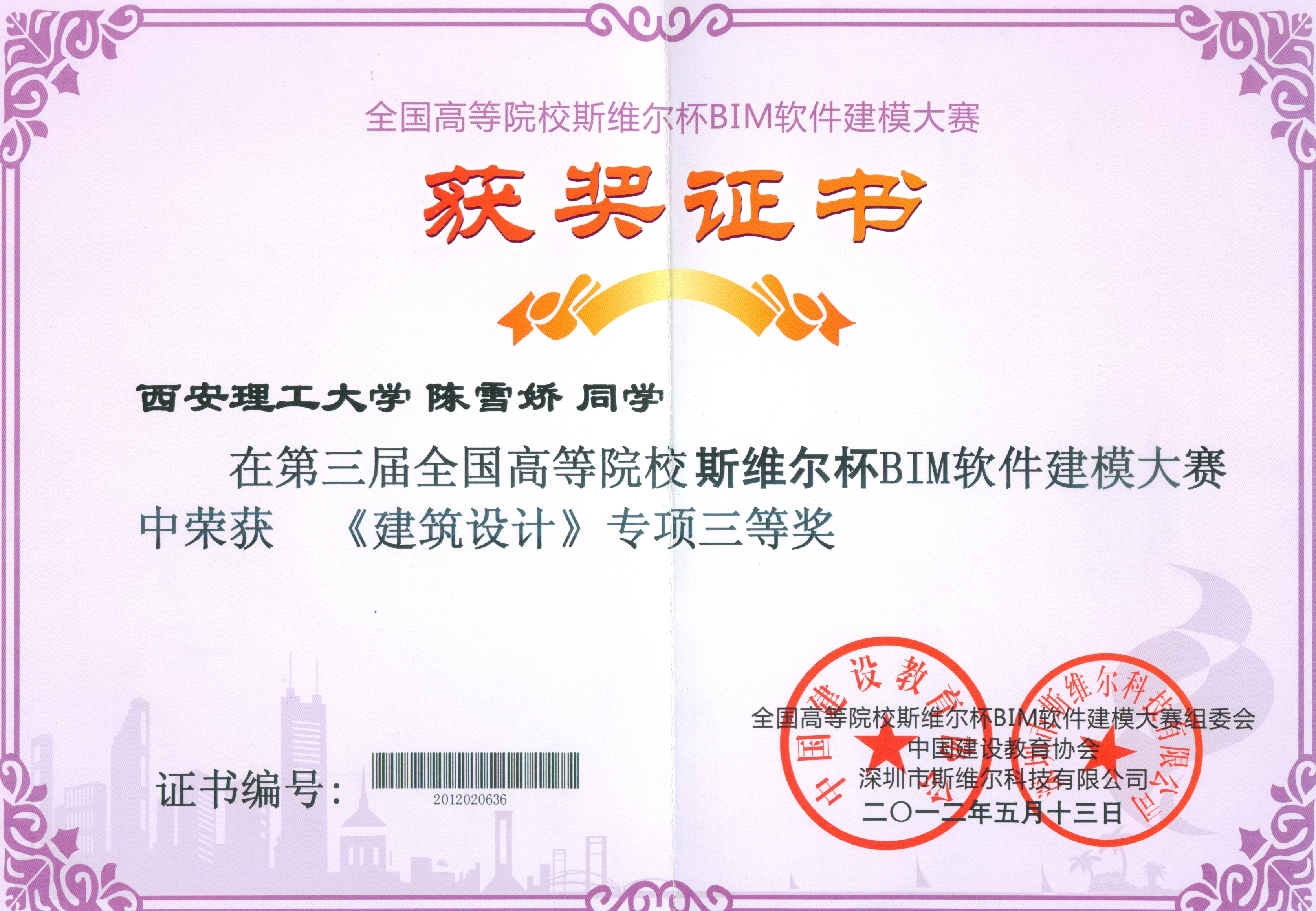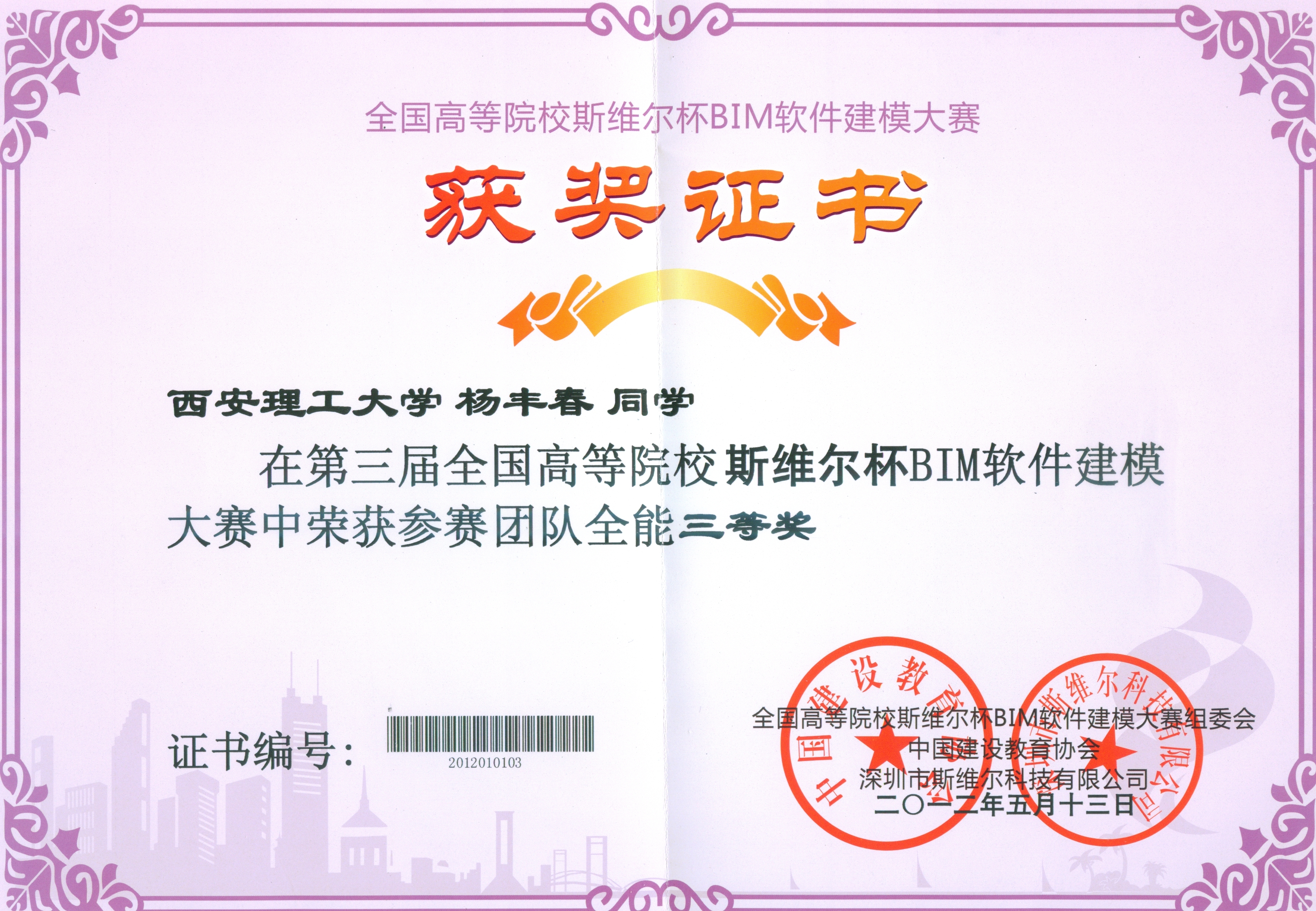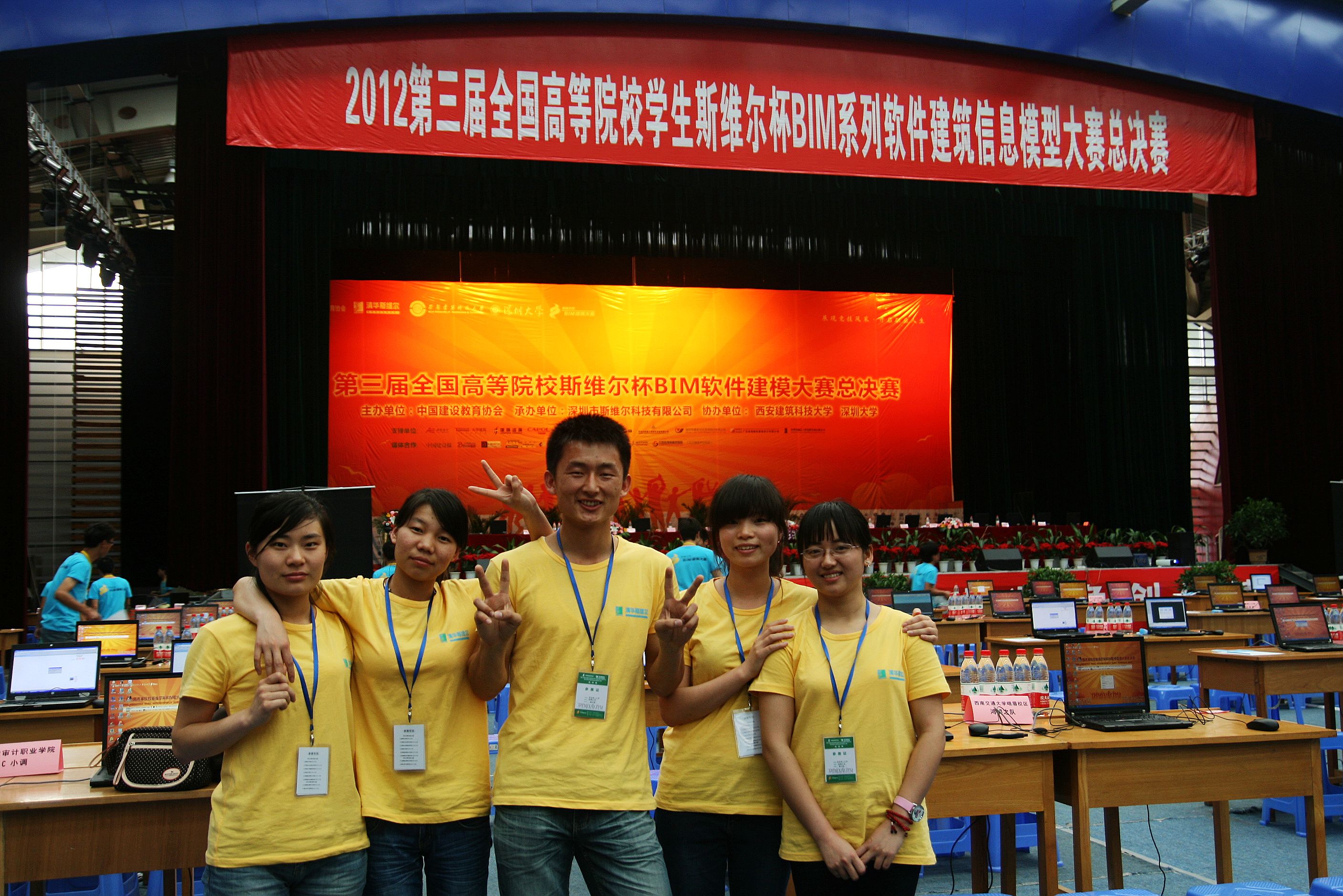 2012年5月13日,历时两天的第三届全国高等院校斯维尔杯BIM软件建模大赛全国总决赛在西安建筑科技大学体育馆落下帷幕。我校bat365中文官方网站“西理之光”团队(由杨丰春、刘维维、徐小钰、李路苹、陈雪娇五位同学组成)参加了八个专项的比赛,分别荣获本科组全能团体三等奖、“建筑设计”专项三等奖和“项目管理与投标工具箱”专项三等奖共三个奖项,西安理工大学获得总决赛优胜奖。
