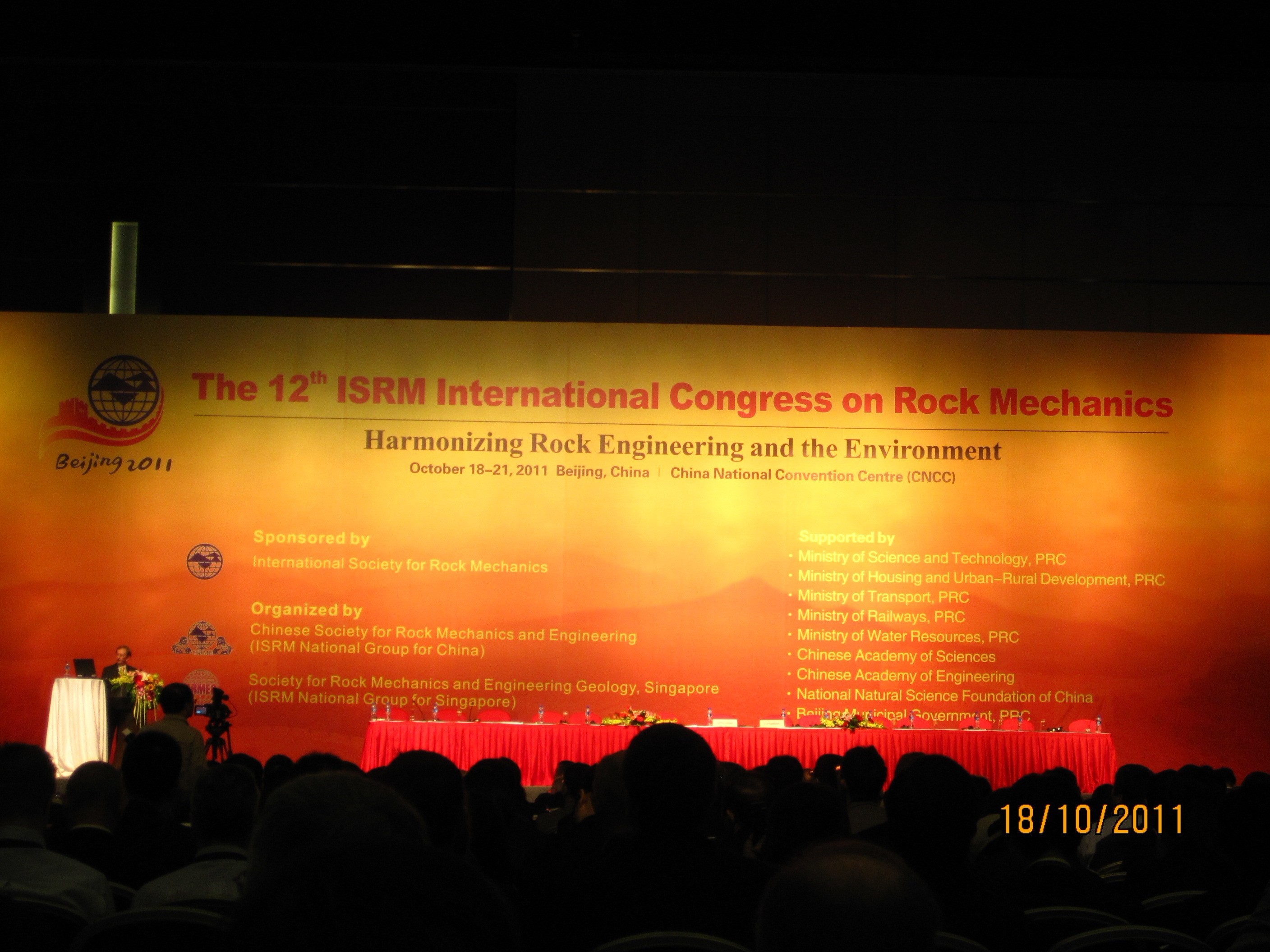 2011年10月18日~21日第12届国际岩石力学大会暨国际岩石力学学会成立50周年活动于在北京国家会议中心隆重举行。应“第12届国际岩石力学大会”组委会邀请,中国岩石力学与工程学会副理事长、陕西岩石力学与工程学会理事长、我校土木工程学科带头人李宁教授,岩土工程研究所副所长张志强博士等一行5人参加了大会。本次大会以“岩石工程与环境和谐发展”(Harmonizing Rock Engineering and the Environment)为主旨,大会由国际岩石力学学会主办,承办单位为中国岩石力学与工程学会和新加坡岩石力学与工程地质学会,来自50多个国家和地区的1100余名岩石力学专家学者参加了大会。 前国际岩石力学学会主席Ted Brown教授,现任国际岩石力学学会主席John Hudson教授分别做特邀报告,回顾了ISRM和国际岩石力学领域50年来的蓬勃发展史,对了岩石力学未来50年的发展前景进行了展望;2011年度缪勒奖获得者Nick BARTON教授做缪勒主题报告。会议期间,我参会代表与国际岩石力学与采矿科学主编、帝国理工学院R.. W. Zimmerman教授(英国)、多伦多大学J. P. Harriso教授(加拿大)、国际岩石力学学会委员会委员Nick BARTON教授(挪威)等知名学者进行了交流与讨论。