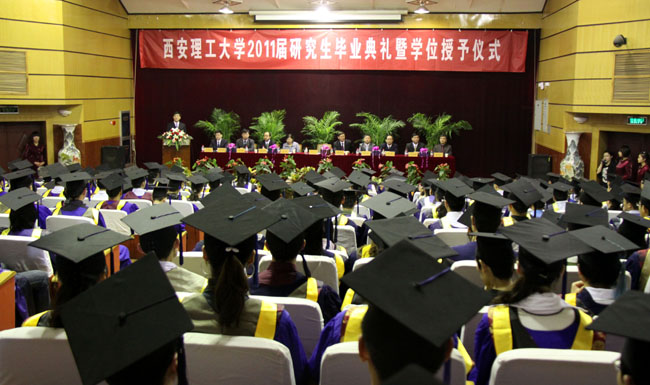 西安理工大学2011届研究生毕业典礼暨学位授予仪式于4月15日在金花校区图书馆报告厅隆重举行。西安理工大学校长刘丁,校党委副书记傅有明、杨萍,副校长刘凯、郭立宏、罗兴锜、李言、刘军、许云华,总会计师赵明扬出席了毕业典礼。毕业典礼暨学位授予仪式由刘凯副校长主持。