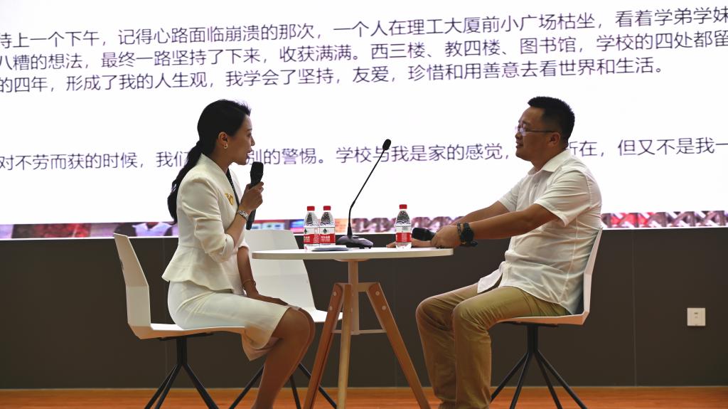 在采访环节,校友杨同生、李辉、刘世鑫分别回顾了在校学习、生活的美好瞬间,表达了对学校及老师的感激之情以及将来会继续用实际行动回馈母校、奉献社会,并且三位校友与在场学生进行了互动,耐心解答了同学们关于行业发展、就业规划等问题。西安三好软件技术股份有限公司董事长张巍作了发言,他回顾了自己与西安理工大学之间的渊源,并作为捐赠企业代表,表示“爬山虎”基金会的成立能够加深校友、企业与学校之间的联系,他也会一如既往地为支持学校的发展。