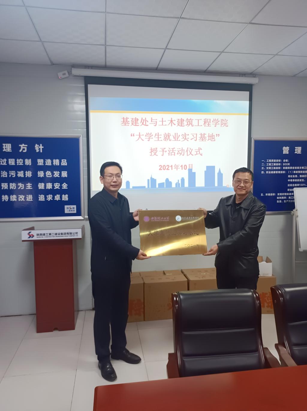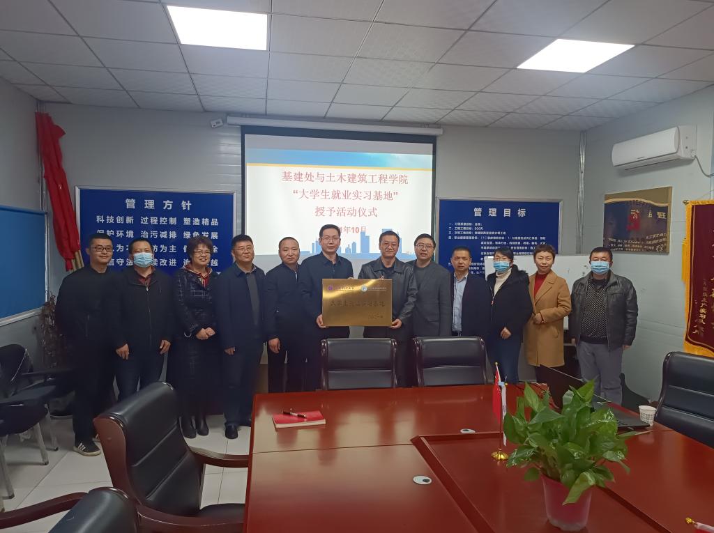 2021年10月26日下午,“大学生就业实习基地”揭牌仪式在金花家属区综合住宅楼项目(一期)工地会议室举行。基建处处长袁建、学院院长朱记伟参加揭牌仪式,基建处副处长刘伦芳主持仪式。