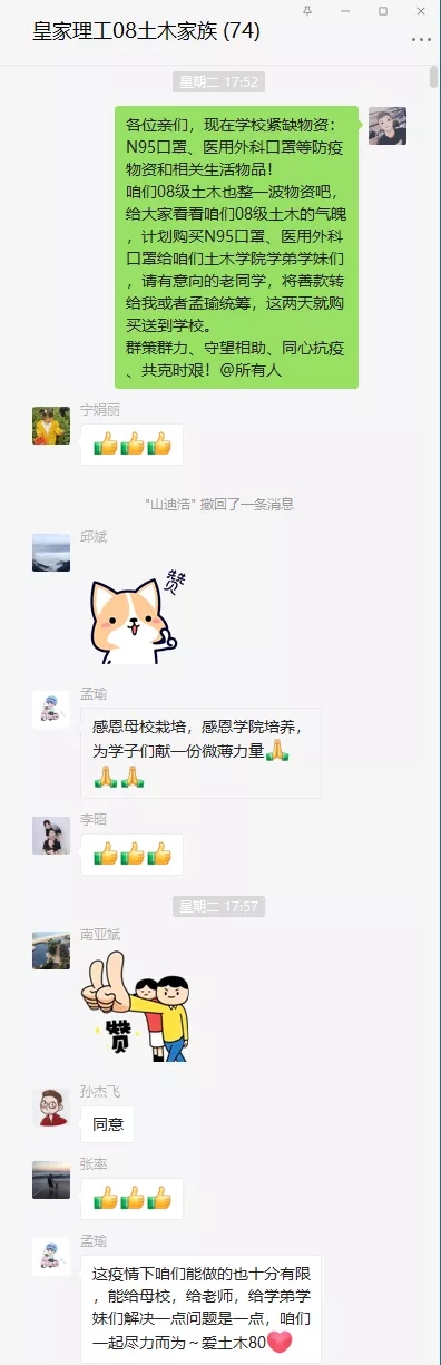 bat365中文官方网站为08级土木工程专业校友的团结共进点赞,对他们心系母校、倾力相助的行动表示崇高的敬意和由衷的感谢。母校将和校友同心聚力、共克时艰,打赢这次疫情防控阻击战!