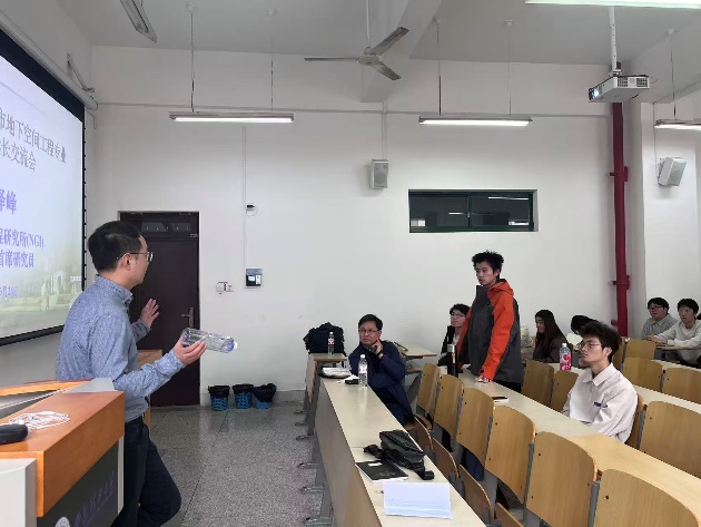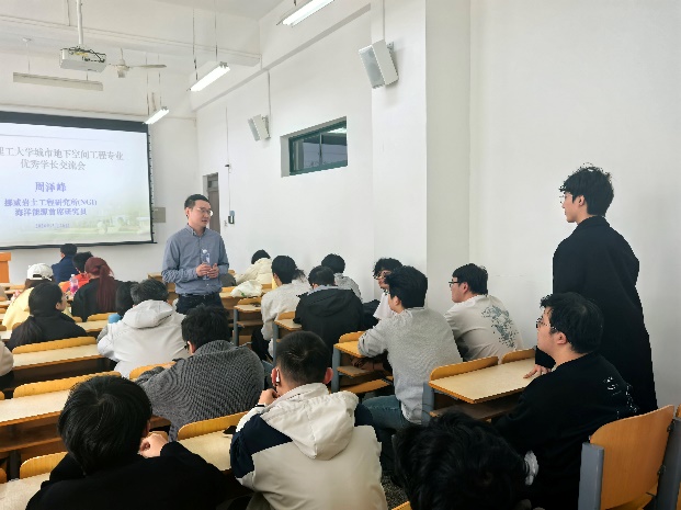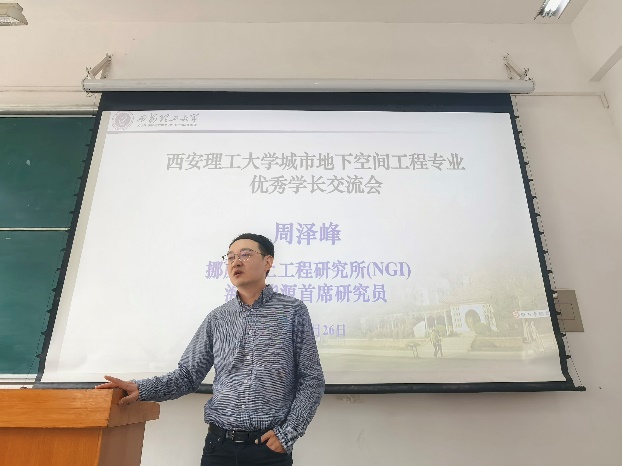 为加强专业认知教育,拓宽学生国际视野,发挥优秀校友的榜样引领作用,3月26日,城市地下空间工程专业优秀学长交流会在曲江校区举行。本次活动特别邀请到我校城市地下空间工程专业首届毕业生、挪威岩土工程研究所(NGI)海洋能源首席研究员周泽峰与城地专业一、二年级学生们开展交流。城地专业负责人张志强、班导师王辉、辅导员罗凡参加活动。交流活动由岩土所教学秘书熊飞主持。