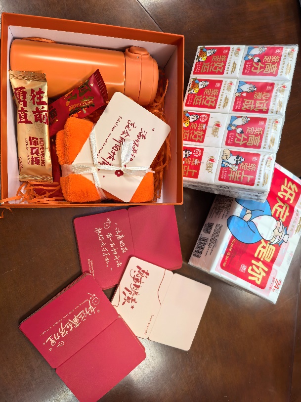 活动现场,色彩明亮的橙色礼包格外醒目——这份被命名为“定橙(成)”的心意礼盒,内含保温杯、毛巾、加油棒棒糖、定制纸巾、祝福卡片与励志摆件。每一件物品都经过精心挑选:保温杯、毛巾套盒为冬日备考增添一份暖意,加油棒棒糖、定制纸巾藏着“你最棒”“'纸'定行”的鼓励,祝福卡片、励志摆件上的暖心字句则承载着学院对学子“坚定信心、积极迎考、坚持不懈、成功上岸”的美好祝愿。