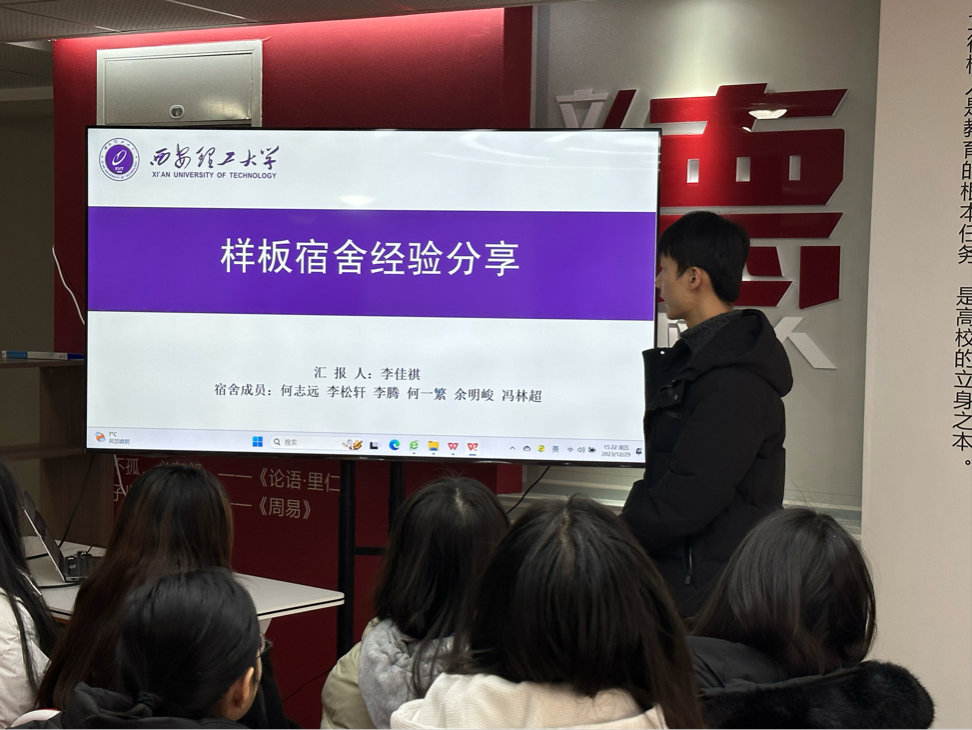 “样板宿舍”代表土木201李佳祺分享样板宿舍经验,从宿舍关系的重要性,舍友关系的处理,宿舍秩序的维护三个方面进行讲解,正因为如此和谐健康的宿舍环境,该宿舍成员中两位保研天津大学和西北农林科技大学。后观看疫情期间“样板宿舍”的温馨充实的宿舍文化活动,向参加活动的同学展示了一个学习氛围浓厚,和谐健康自然的宿舍环境。
